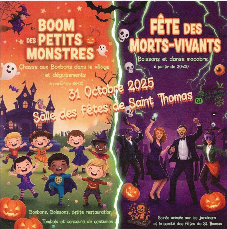 Halloween 2025 8 octobre 2025 Suite au succès que cette soirée d’HALLOWEEN a connue l’année dernière, le comité des fêtes et les jardiniers de SAINT-THOMAS vont la renouveler pour le plus grand bonheur des enfants et des parents :